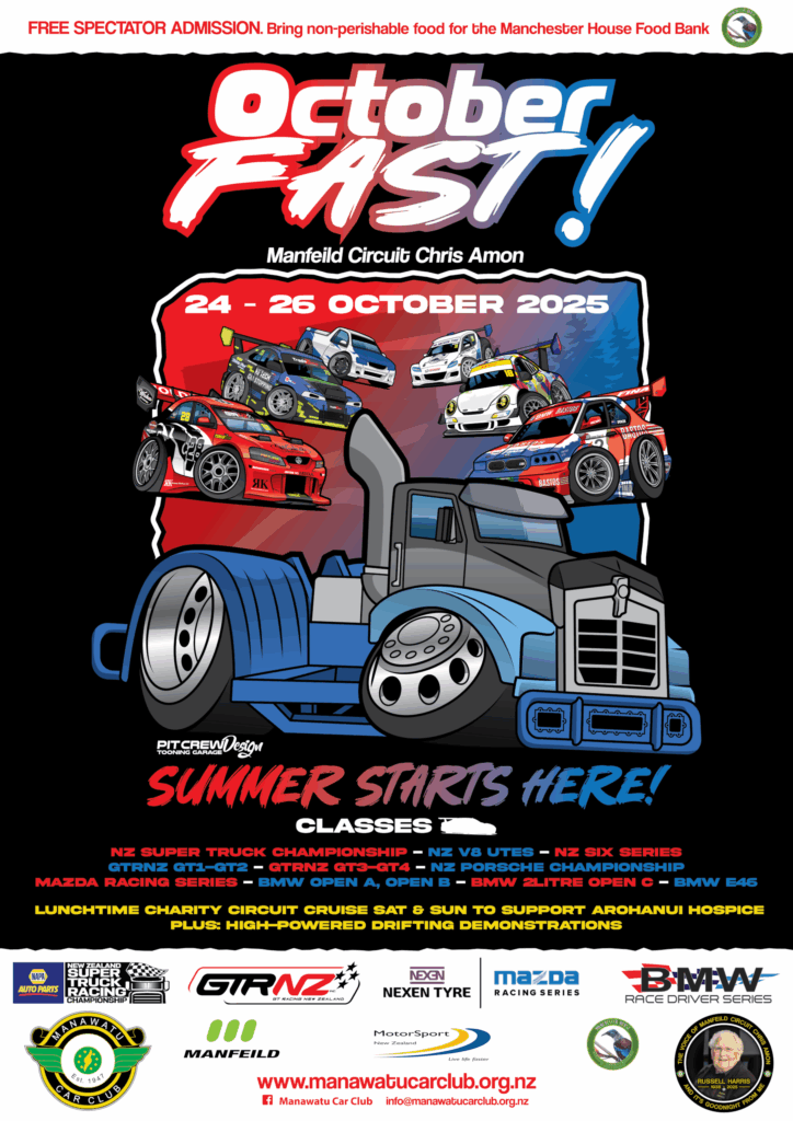 Labour Weekend, Friday 24th October 2025 through to Sunday 26th October 202 at Manfeild Circuit Chris Amon! Racing from 9:00am – 5:00pm
